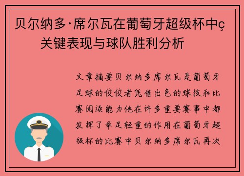 文章摘要:贝尔纳多·席尔瓦是葡萄牙足球的佼佼者,凭借出色的球技和比赛阅读能力,他在许多重要赛事中都发挥了举足轻重的作用。在葡萄牙超级杯的比赛中,贝尔纳多·席尔瓦再次证明了自己的价值。他的关键表现帮助球队夺得了胜利,并为比赛的走势注入了极大的动力。本文将从四个方面详细分析贝尔纳多·席尔瓦在该场比赛中的表现及其对球队胜利的贡献:技术层面的统治力、场上智慧的发挥、与队友的默契配合以及比赛态度和领导力的体现。通过这些角度的分析,旨在揭示贝尔纳多·席尔瓦如何成为葡萄牙超级杯胜利的重要推手。